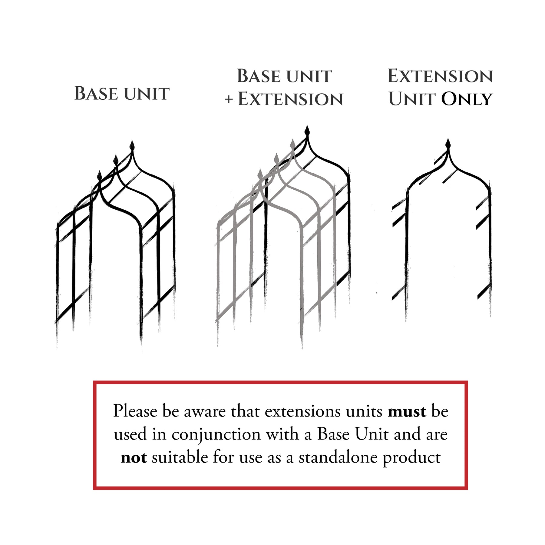 The extension is not a standalone product. It must be used with a compatible base pergola and cannot be installed on its own.